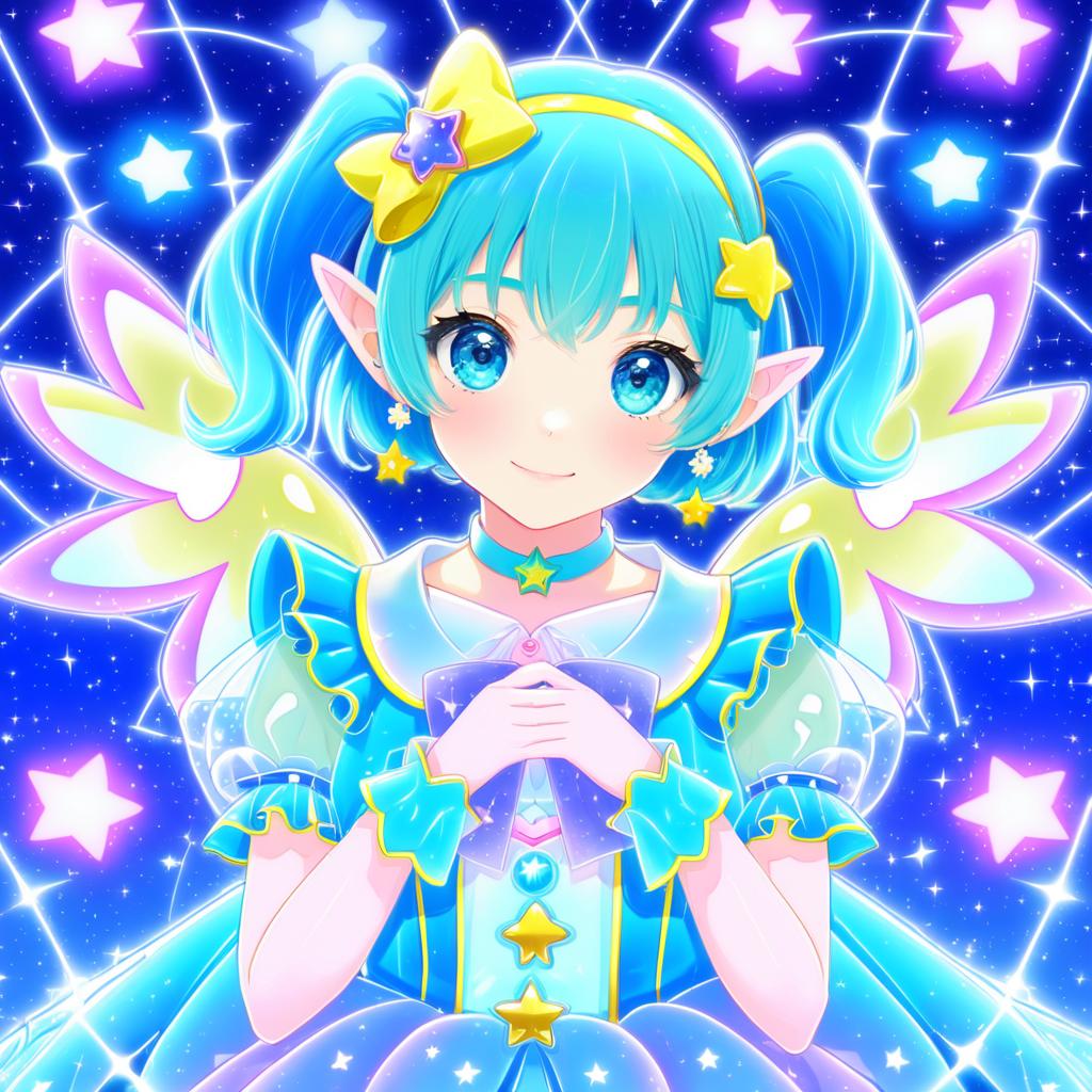 Illustration of a magical girl character with aqua blue hair styled in twin tails, pointed elf-like ears, and bright aqua star-shaped pupils. She wears a detailed magical girl costume featuring a yellow hairband with star ornaments, star earrings, an aqua choker, and a dress with puffy see-through sleeves and star decorations. The background is filled with glowing stars and vibrant blue tones creating a cosmic, magical atmosphere. The art style is anime-inspired with a focus on bright and sparkling elements.