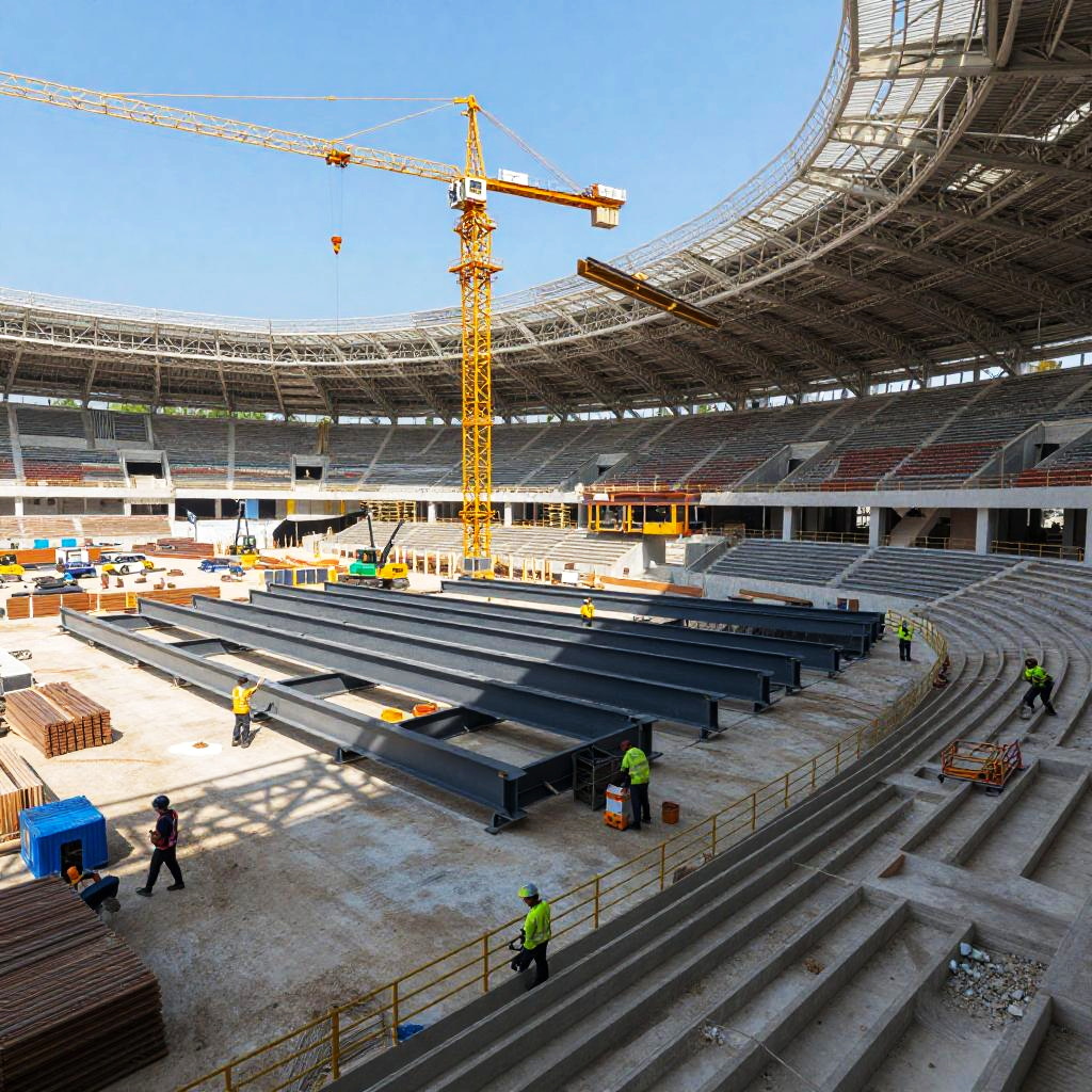 Stadium builder constructing a large open-air stadium, workers assembling steel beams and concrete stands, a bustling construction site with heavy machinery, cranes lifting materials, clear sky, vibrant colors, realistic textures and intricate details