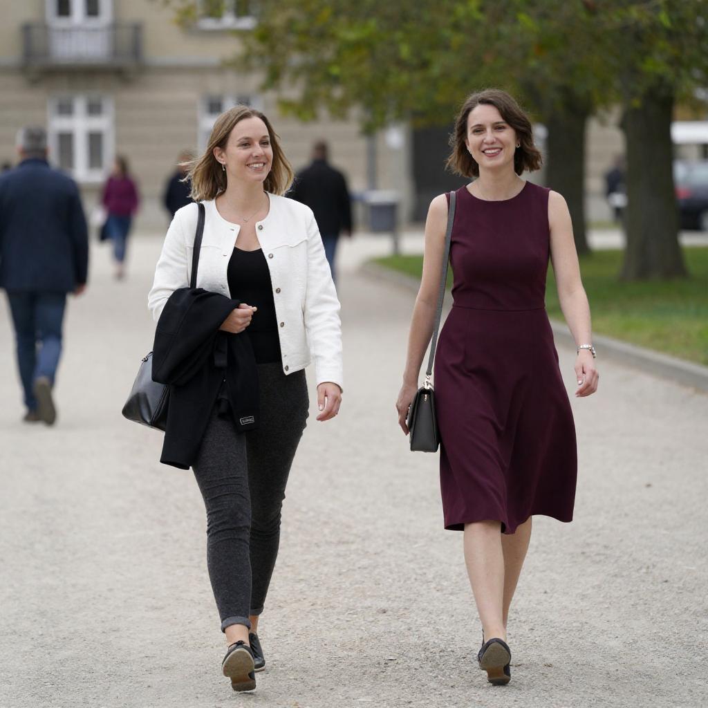 Photograph of two smiling women walking outdoors on a gravel path. The woman on the left has light brown hair, wears a white jacket over a black top, and carries a black jacket and bag. The woman on the right has short brown hair, wears a sleeveless maroon dress, and carries a gray bag. Background includes trees, a building, and other pedestrians.