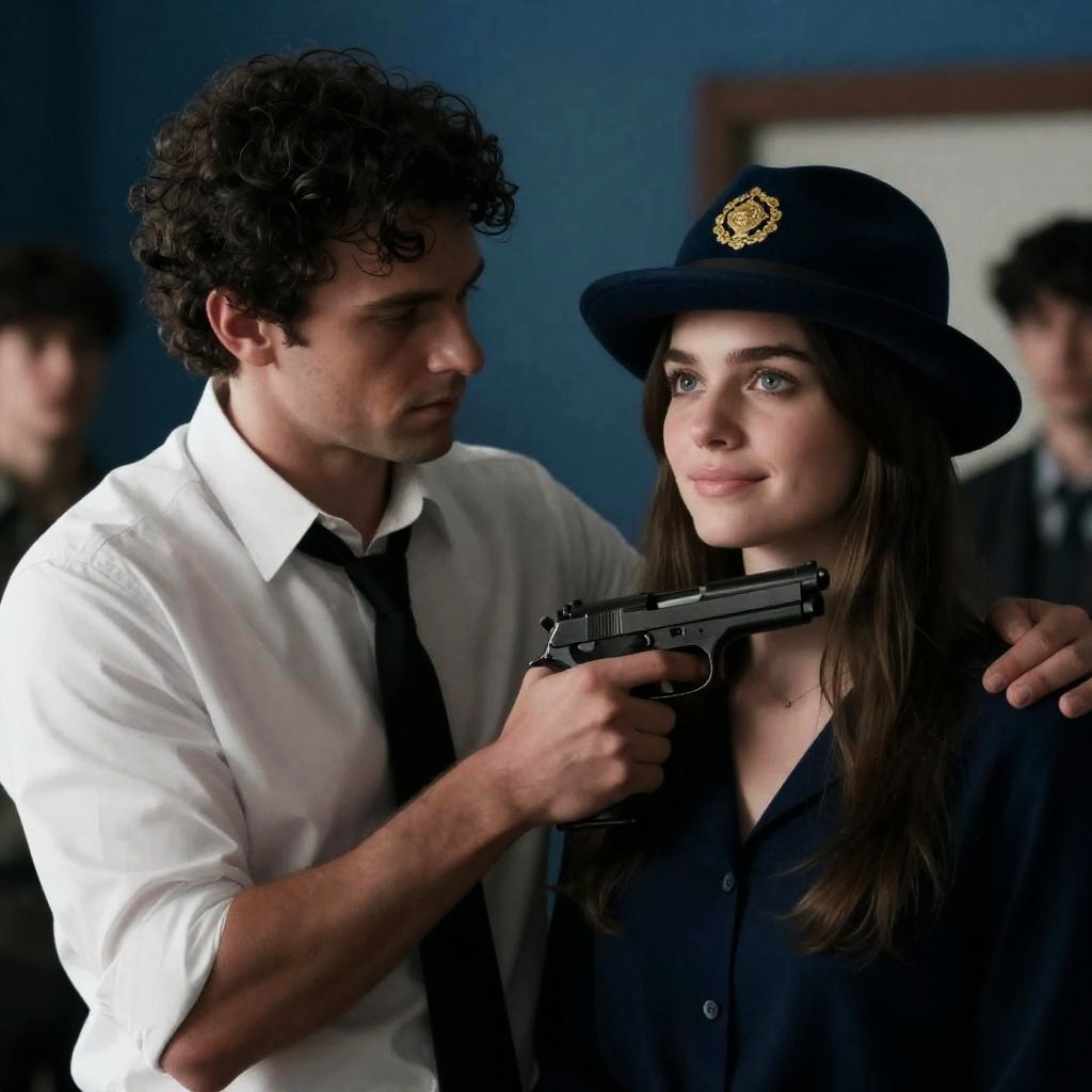 Photograph of a movie poster. Three scenes: top left, a man in a brown suit holding a glass, woman with brown hair; top right, a man in a white cap and blue shirt, woman in pink shirt, outdoor table; bottom, hand holding gun, white ribbon, dollar sign, characters from top right. Blue and yellow background.