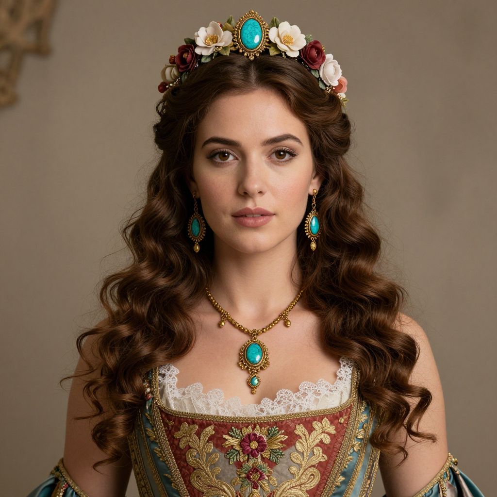 Elegantly adorned with a floral headpiece featuring a central turquoise gem, a woman with cascading brown curls wears a regal ensemble comprising a gold necklace with matching earrings, a lace-trimmed neckline, and a richly embroidered bodice, evoking the timeless grace of Diana the Huntress.