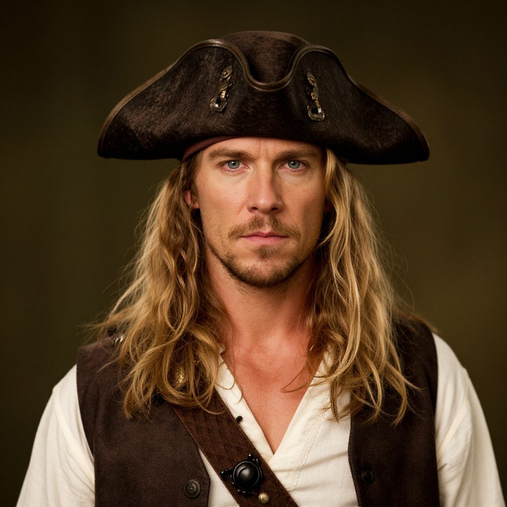 A man with long blonde hair is wearing a pirate hat and a brown vest.