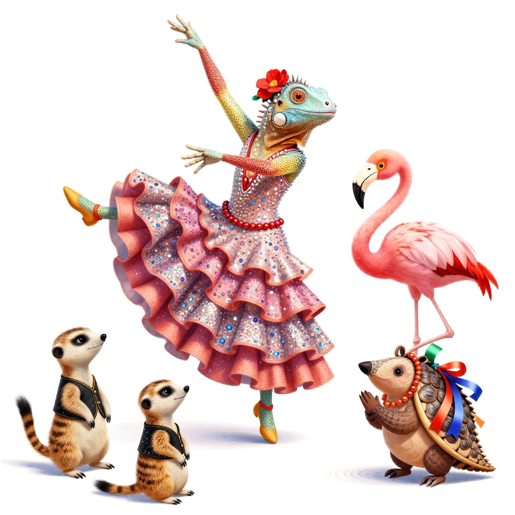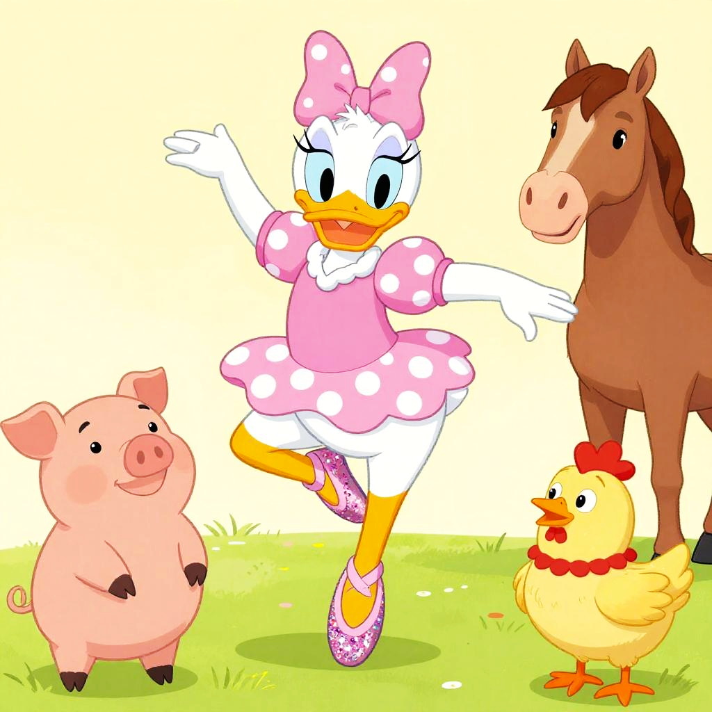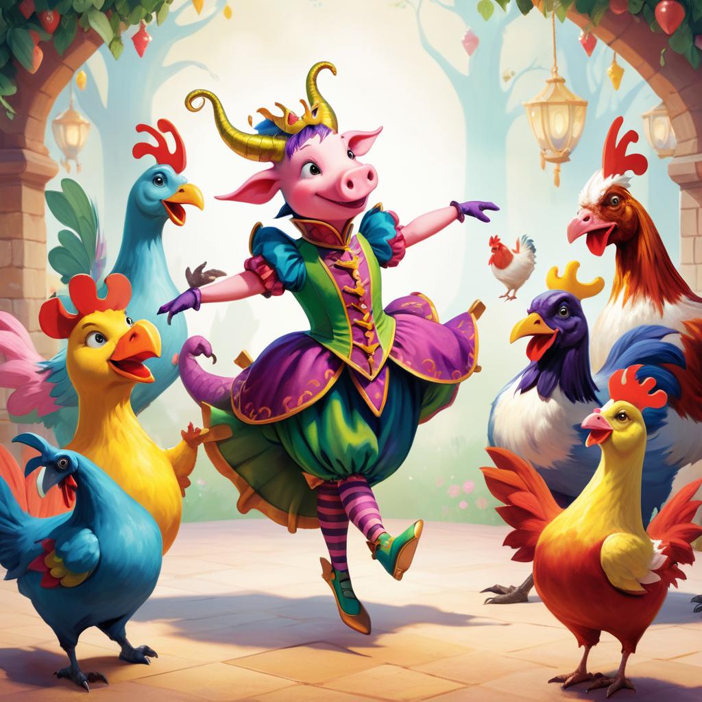 A whimsical and colorful illustration of Wendy the Dragon in a jester outfit, standing on her hind legs with her arms extended as if she’s dancing ballet. Her friends, a pig, a horse, and a chicken, are watching her in awe.