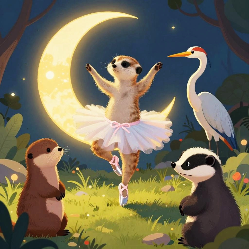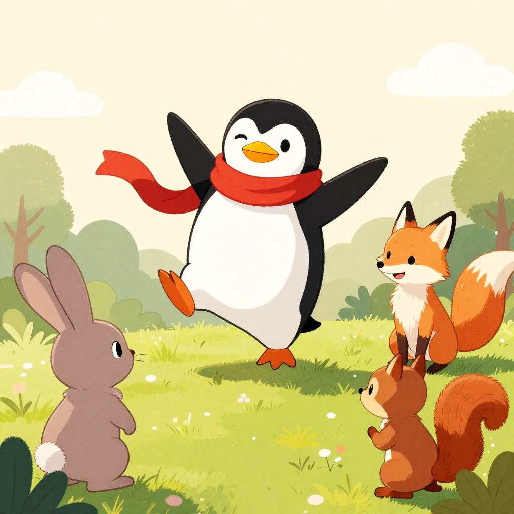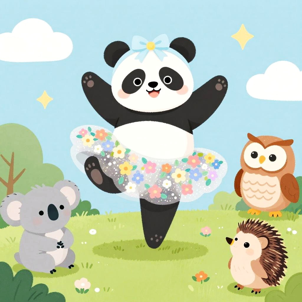 A whimsical and colorful illustration of Wendy the Dragon in a jester outfit, standing on her hind legs with her arms extended as if she’s dancing ballet. Her friends, a pig, a horse, and a chicken, are watching her in awe.