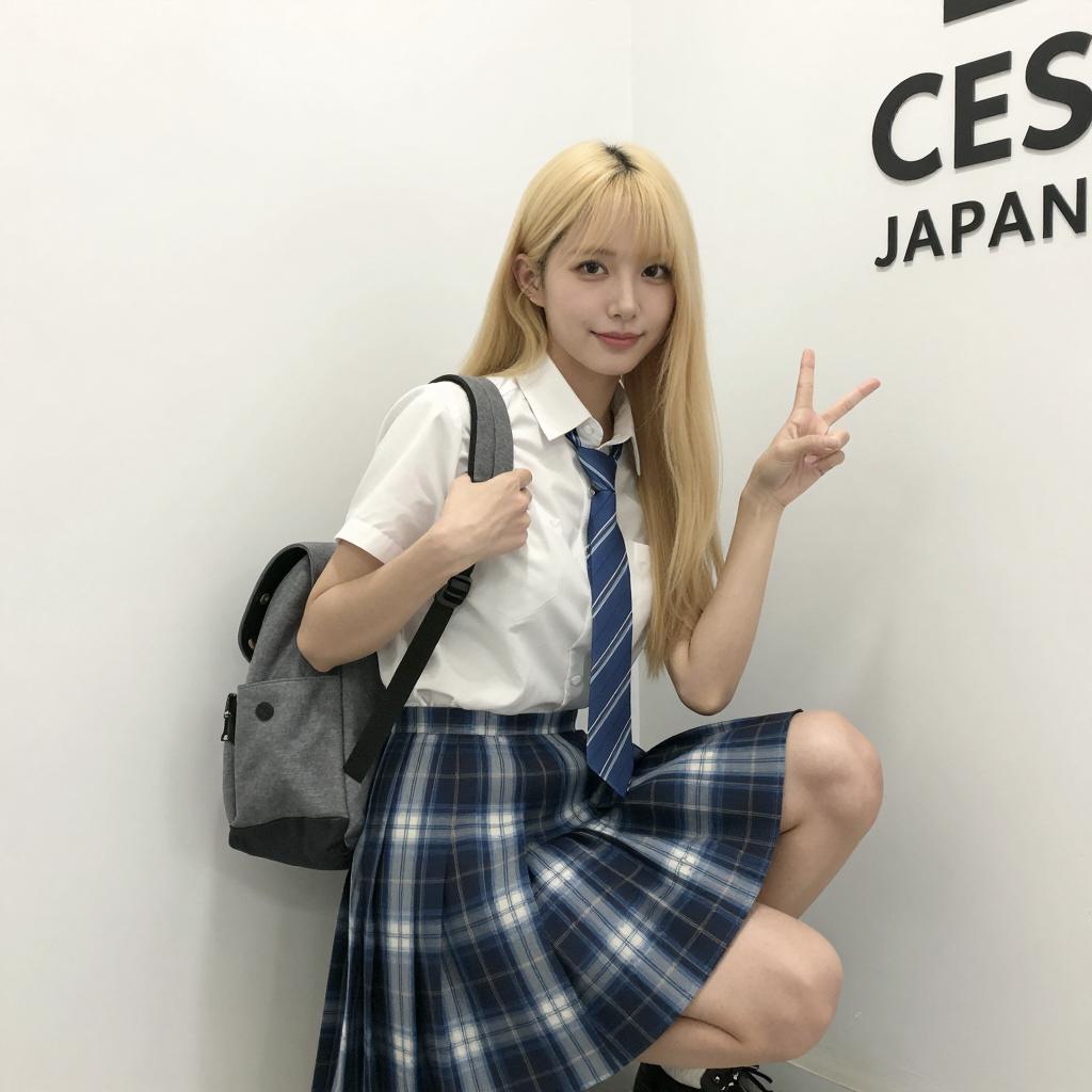 Asian woman with long blonde hair, wearing a white shirt, blue tie, and blue plaid skirt, squatting against a white wall. She holds a gray backpack over her shoulder, makes a peace sign with her right hand. Her face has a slight smile. The background is plain white. Her legs are spread apart. Textured wall. "CES JAPAN" on the right side.