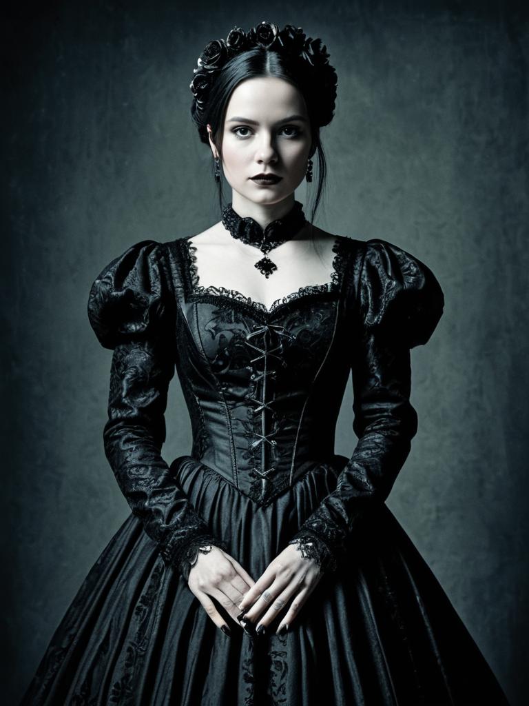 Photorealistic detailed studio portrait of a woman wearing an elegant black Gothic gown with puffed sleeves, lace cuffs, and intricate beaded embellishments. She has a pale complexion, dark lipstick, and a black floral headpiece, complemented by a matching choker necklace and delicate earrings. The moody background enhances the dramatic and vintage Gothic style.