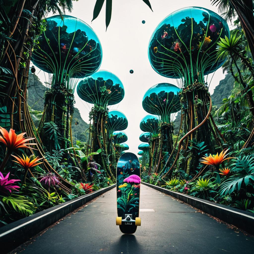 Skateboard Sticker create a scene for a fantastic, beautiful and amazing world, gigantic colorful alien flower fields, whimsical futuristic domes blending natural shapes, very big and wide, wide view that allows you to observe the whole scene, hyper realism, extreme quality, movie quality, 8k, extraordinary details, extremely real