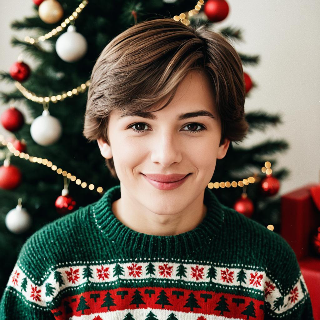 Holiday sweater,1boy, christmas tree, male focus, solo, sweater, christmas ornaments, christmas, looking at viewer, realistic, brown hair, smile, indoors, long sleeves