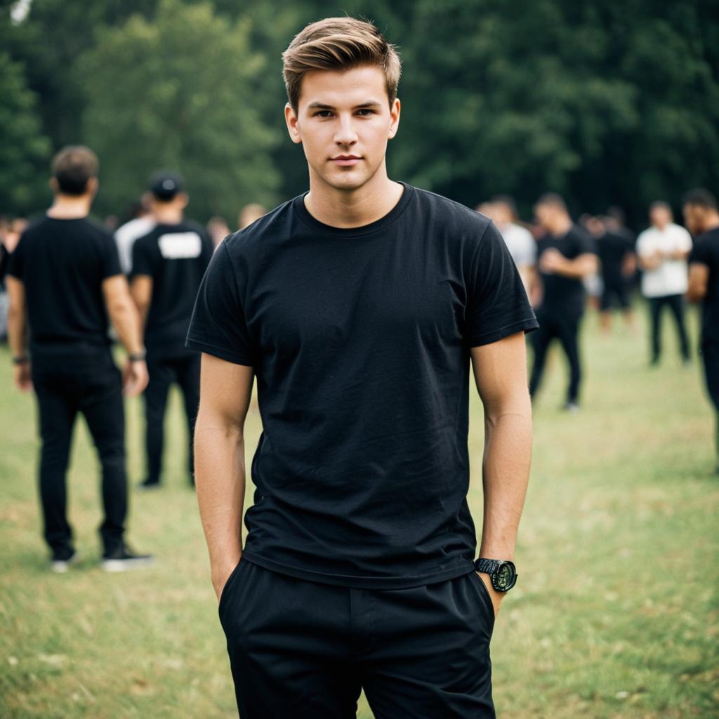 Portrait of a young man with short light brown hair wearing an all-black outfit consisting of a black t-shirt and black pants. He is standing outdoors on grass with a blurred group of similarly dressed people in the background. The man has his hands in his pockets and is wearing a black wristwatch, looking directly at the camera with a neutral expression.