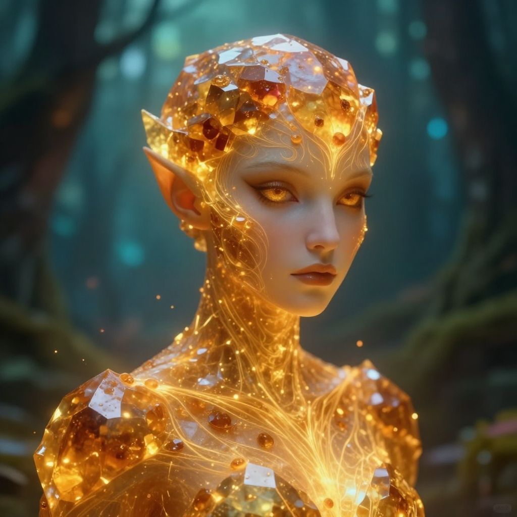 Amber official art, close-up digital painting of a mystical character with amber-colored crystalline skin, ethereal glowing patterns, surrounded by enchanted forest ambiance