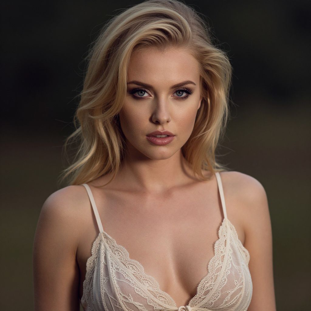 Photograph of a young Caucasian woman with wavy, shoulder-length blonde hair, fair skin, and blue eyes. She wears a white lace camisole with thin straps, revealing a modest cleavage. Her makeup is subtle yet striking, with dark eyeliner and pink lipstick. The background is dark and blurred, focusing attention on her. The lighting highlights her facial features and the delicate lace texture of her top. The overall style is modern and elegant, with a slight cinematic feel.