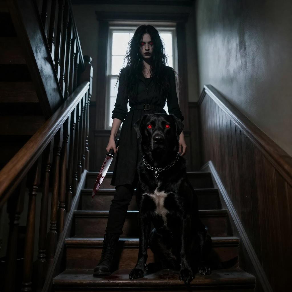 Photograph of a dark, eerie hallway. Woman with long, disheveled hair, glowing red eyes, holding bloody knife. Large, black dog with glowing red eyes, wearing chain collar, sitting beside her. Both standing on wooden staircase with bannisters. Bright window behind them. Woman and dog facing forward, intense expressions.