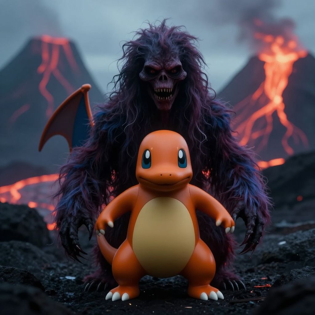 Cinematic shot of a scary creepy and hairy alien creature with mystical traits blended with orange Charmander traits, photorealistic, soft focus, volcano mountains lava, Cinematic lighting