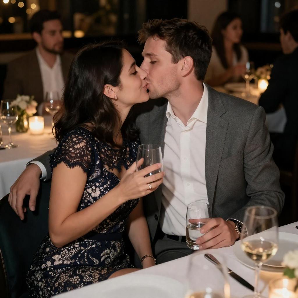 Photograph of a couple kissing in a dimly lit restaurant. Woman in dark lace dress, holding glass, smiling. Man in gray suit, white shirt, kissing her forehead, holding glass, looking down. Background: seated man in brown suit, blurred. Tables with wine glasses, floral centerpiece. Dim, warm lighting. Several people, casual, elegant attire.