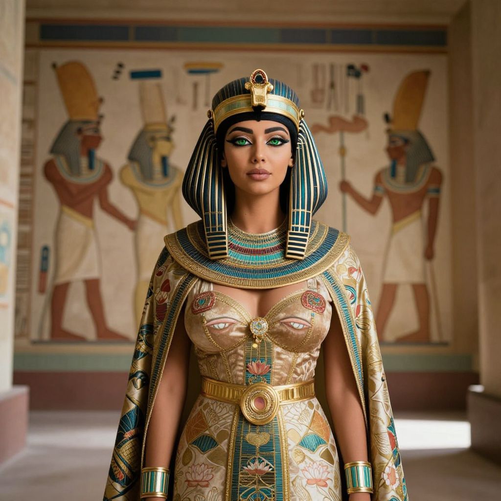 A dramatic, cinematic image of an elite Egyptian noblewoman in a full Egyptian royalty costume—richly patterned with lotus motifs and gold threads—wearing a ceremonial gown and a diadem, standing before a large mural of ancient pharaohs in a grand museum hall in Luxor, with soft lighting and shadows; she has bright green eyes, fair complexion, and a poised, confident gaze. The woman has big breasts and cute face