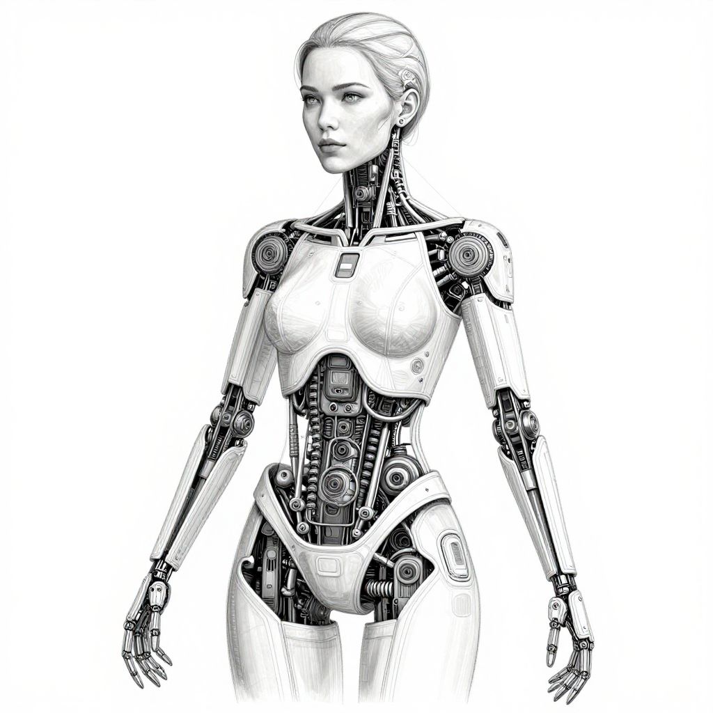 A detailed schematic diagram of a cybernetic woman, showcasing intricate mechanical and electronic components within her body.