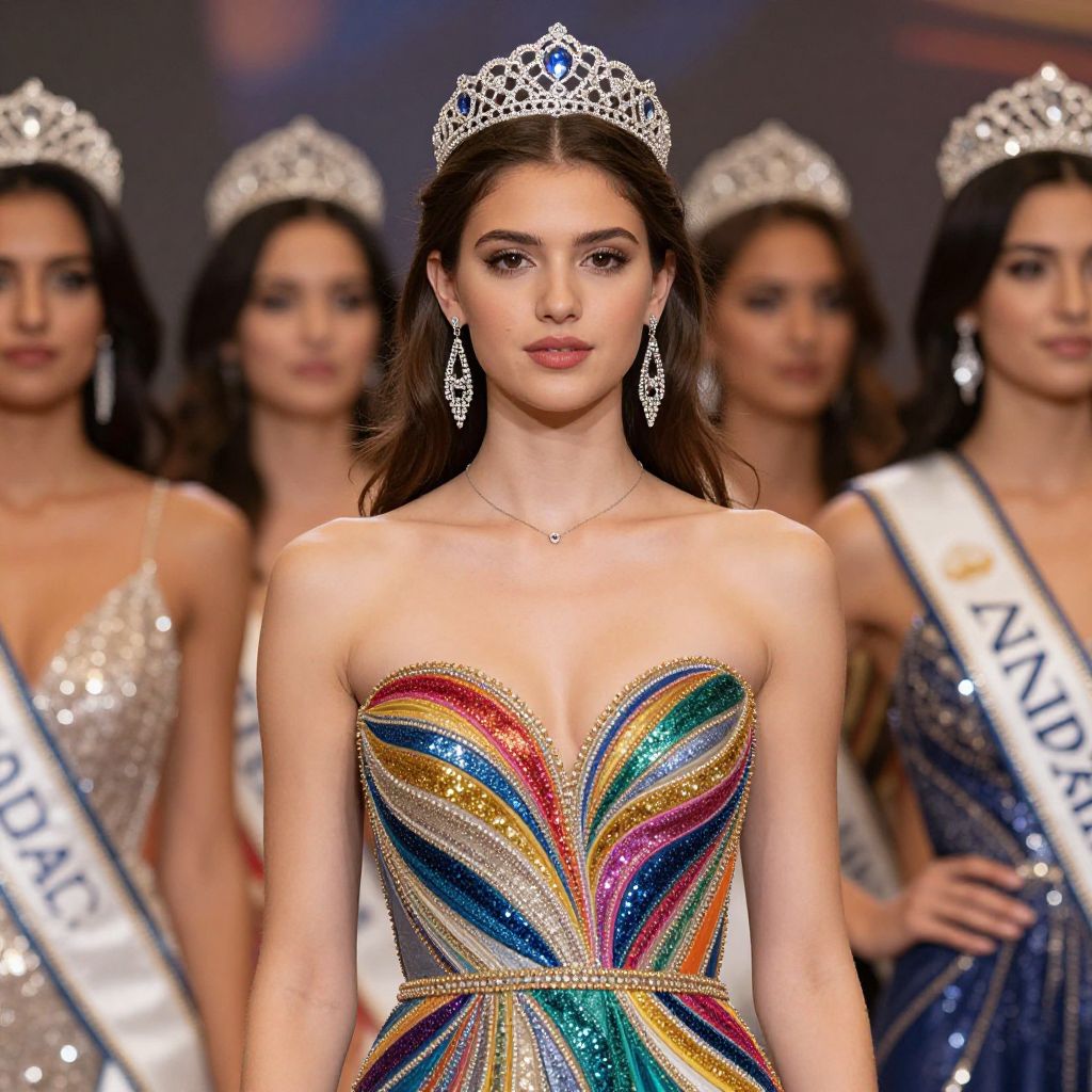 Photograph of a beauty pageant contestant in the foreground, wearing a strapless, colorful, sequined gown with an abstract, multicolored pattern, and a silver tiara. She has long, dark brown hair, fair skin, and wears large, dangling silver earrings. Her expression is neutral. In the blurred background, three other contestants with similar silver tiaras and sashes reading "MISS" are visible, wearing different sparkling dresses. The setting is a brightly lit stage with a dark backdrop. The overall style is glamorous and formal, capturing the elegance and competition of the pageant.