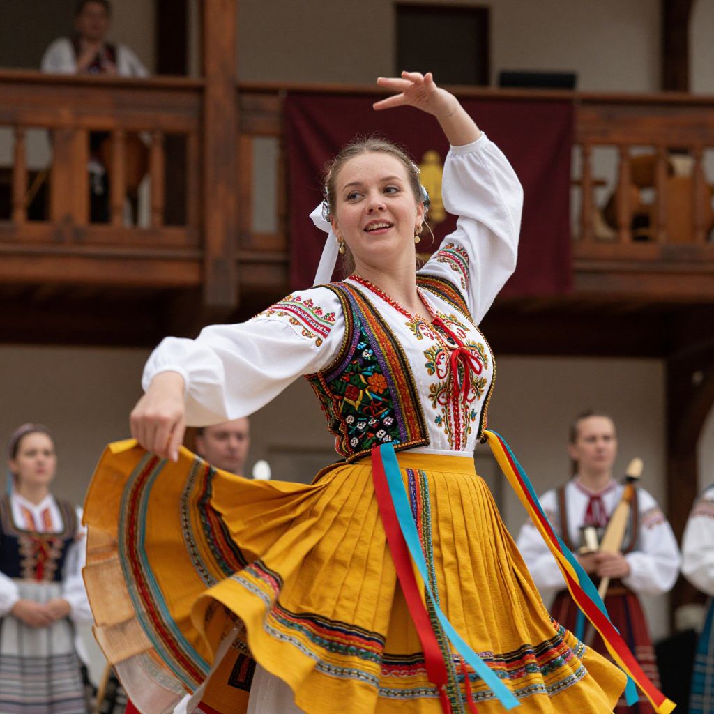 A cinematic portrait of a Polish woman dressed as a folk dancer, wearing a flowing colorful vest with fluttering ribbons in saffron, crimson, and turquoise, her face bright and expressive with a slight smile, dancing in a traditional outdoor theater setting with wooden balconies and folk music instruments in the background.. The woman has big tits and cute face