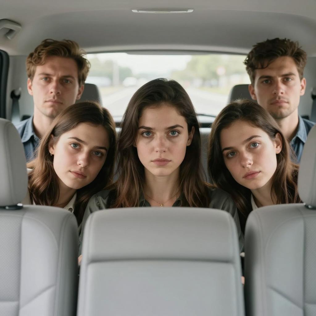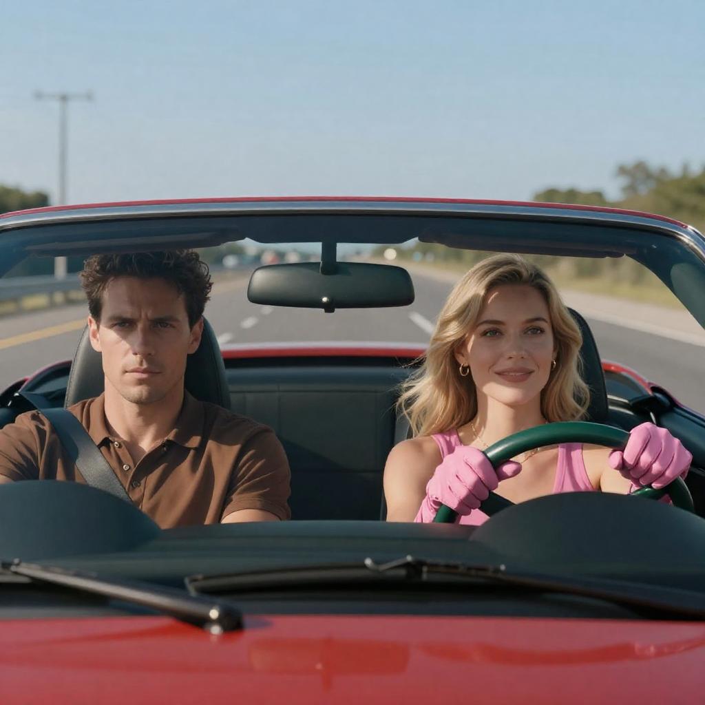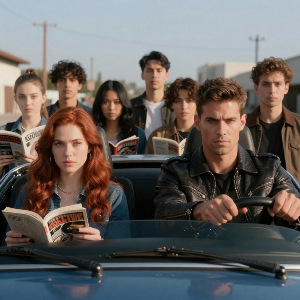 Group of seven people in a blue convertible, urban background. Driver, muscular, short brown hair, leather jacket, intense expression. Red-haired woman in front, serious look. Others with varied hairstyles, casual clothing, holding magazines. Sunlit, clear sky. Power lines, buildings in background. Driver's right arm out, steering wheel in hand.