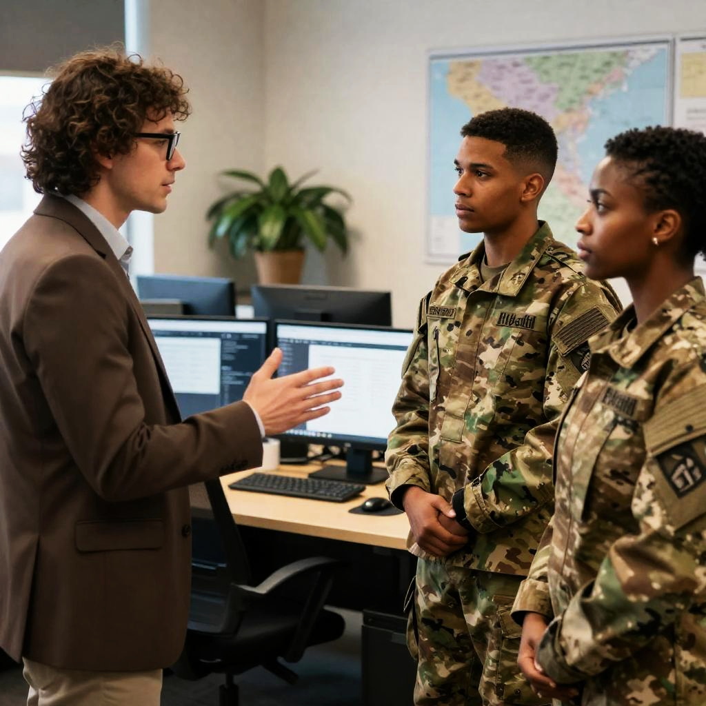 Photograph of a dimly lit, modern café at night. A soldier in camouflage, crouching, reads a letter to a young girl with blonde hair, sitting on the floor. Warm, yellow lights from the café's interior illuminate the scene, contrasting with the dark exterior. The soldier's focused expression and the girl's attentive posture create an intimate moment.