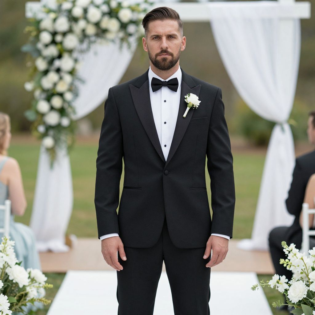 Wedding Jumpsuit Costume, man in a tuxedo standing in front of a wedding ceremony