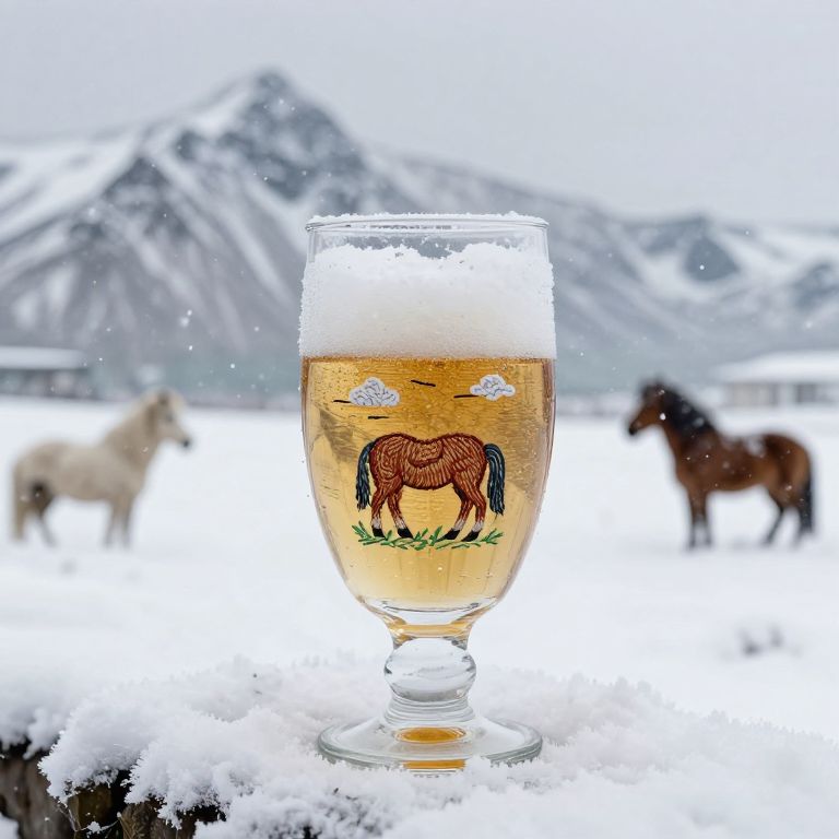 Embroidery Sampler Goblet glass of beer outside in the snow in a extreme snow storm with icelandic snowy mountains in the background and icelandic horse,