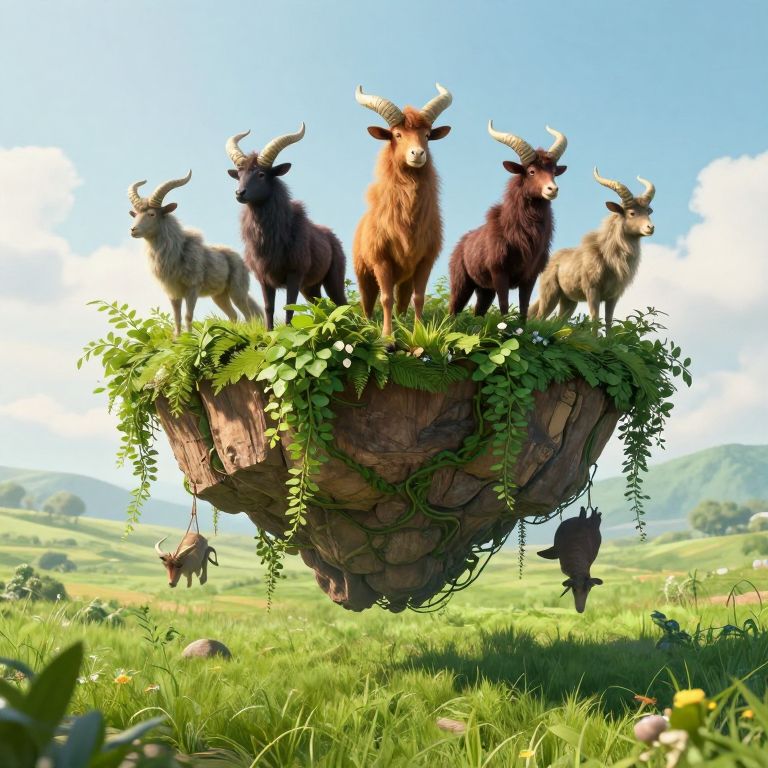 Digital artwork of five goats with varying fur colors and horn sizes standing on a floating, moss-covered rock in a lush, green meadow. The goats, in shades of brown, black, and beige, gaze forward. The rock is adorned with green vines and leaves. In the background, a bright blue sky with scattered clouds and rolling hills are visible. A small, gray goat is seen leaping from the rock to the grass below. The scene is vibrant and whimsical, with a fantasy-like atmosphere.