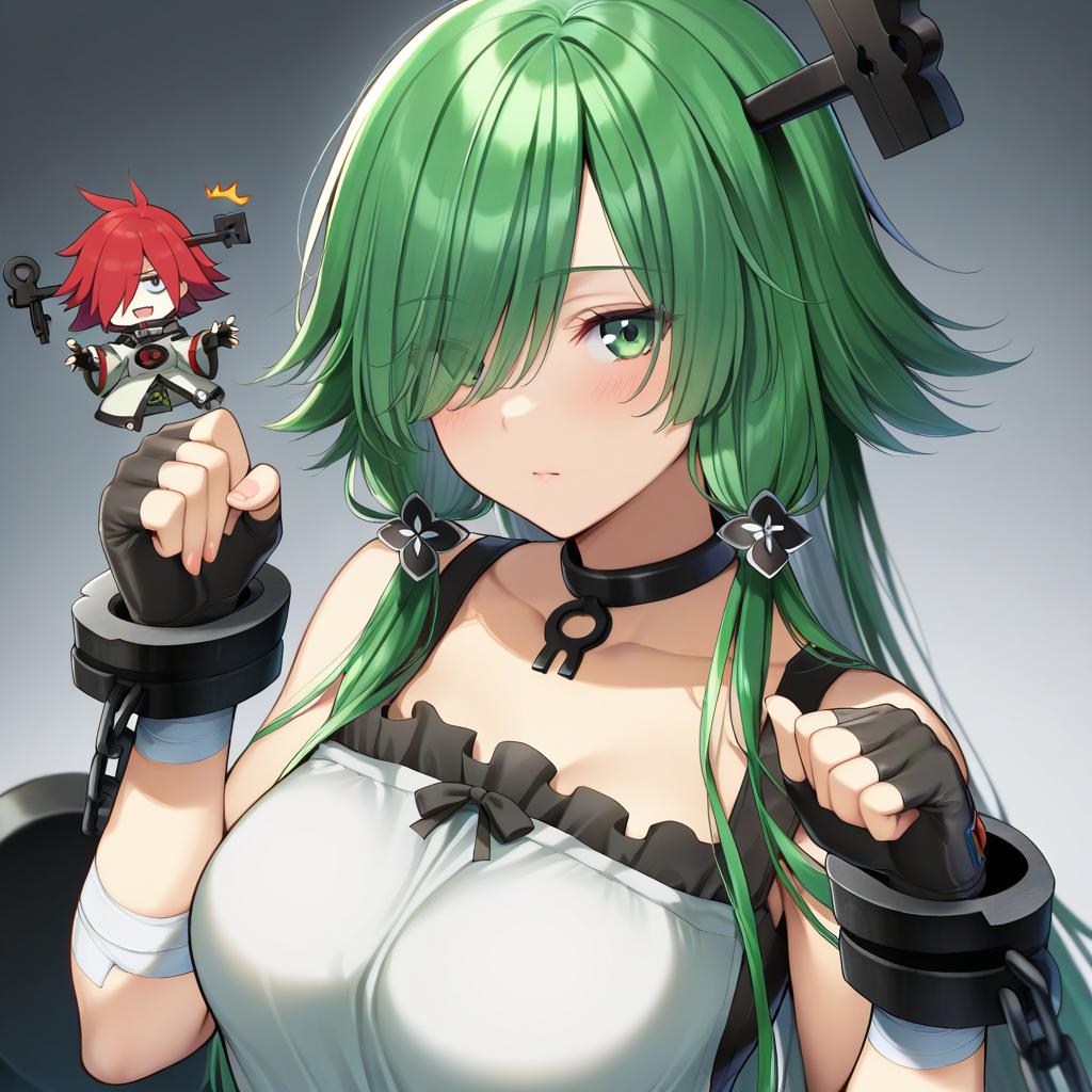 Detailed anime-style artwork featuring a young girl with vibrant green hair partially covering one green eye. She wears a white and black outfit with a black choker and matching black fingerless gloves. The girl has bandages on her arms, heavy wrist chains with shackles, and an expression of calm determination. A small, chibi-style red-haired character is perched on her left hand, adorned with a key-like object through its head. The image combines elements of fantasy and gothic aesthetics.