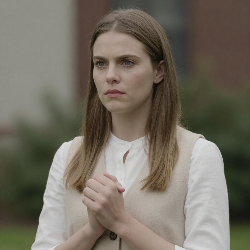 Photograph of a serious-looking woman with light skin, blue eyes, and dark brown hair in a side ponytail. She wears a grey sleeveless top with a red strap. Background shows blurred greenery. Natural light highlights her face.