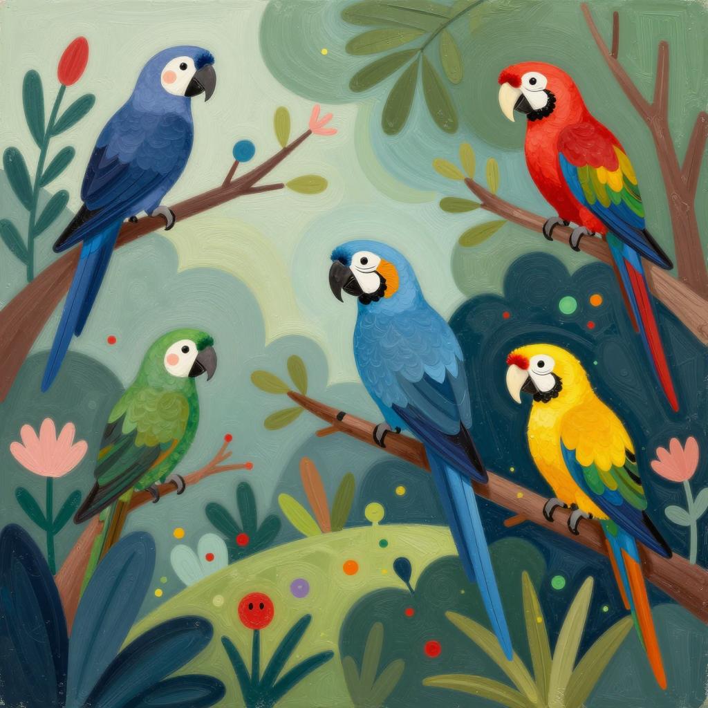 A vibrant and whimsical digital artwork depicting multiple colorful parrots perched on branches within an abstract garden. The composition features energetic and chaotic brushstrokes inspired by Picasso's cubist style, with surreal and vivid tones that create a playful and expressive atmosphere. The image showcases a variety of parrots in bright blues, reds, yellows, and greens surrounded by lush, stylized foliage and floral elements.