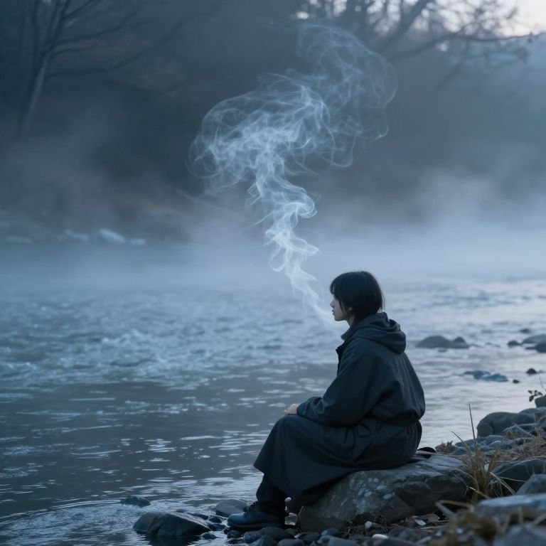 Serenity and solitude intertwine as a figure sits by a mist-shrouded river, where the ethereal flow of frozen smoke whispers ancient secrets, inviting introspection amidst the quiet embrace of nature.