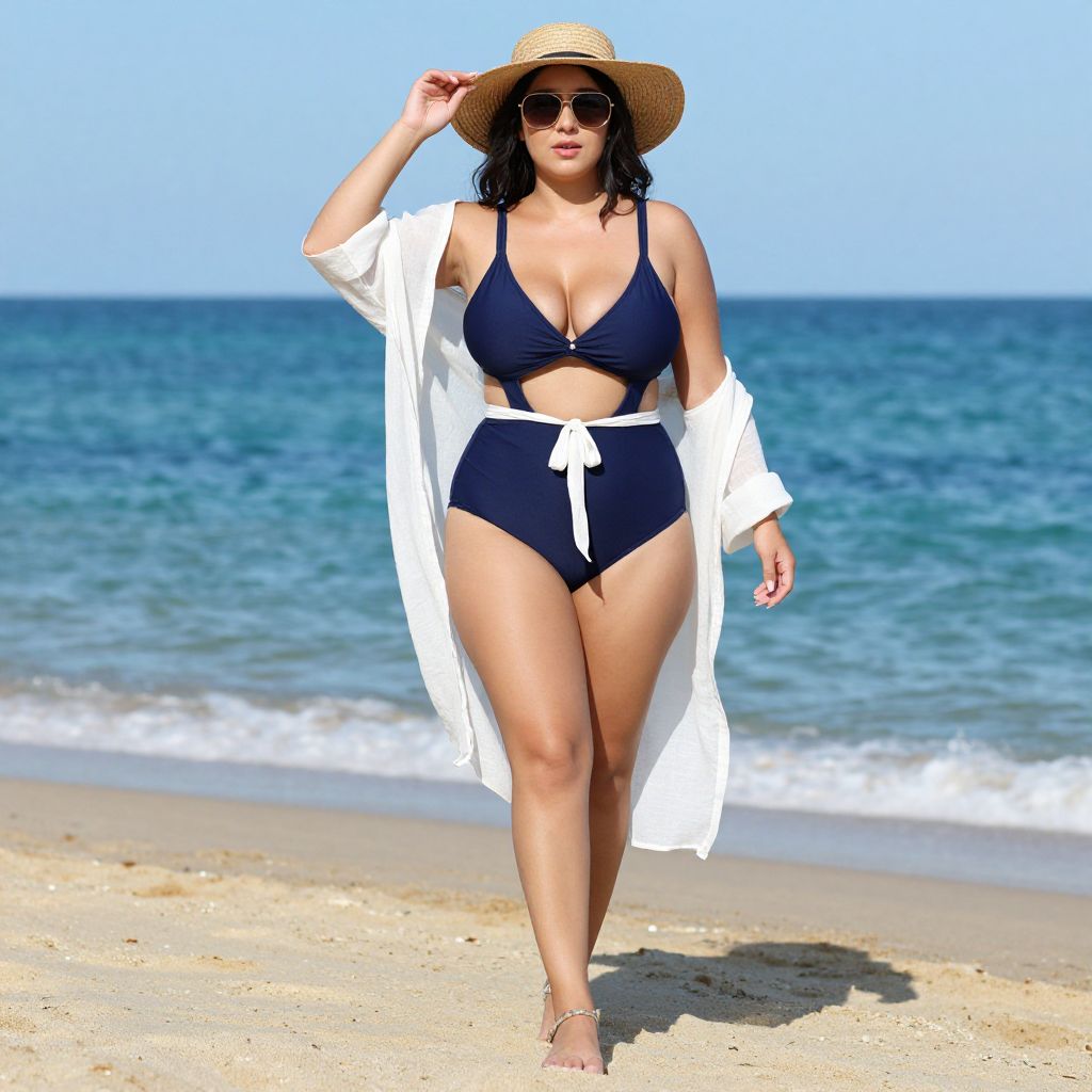 Full body shot, stocky woman, cut-out swimsuit, deep navy blue, high-cut legs, plunging neckline, adjustable straps, soft stretchy fabric, lightweight beach blouse, sheer white linen, oversized fit, billowy sleeves, open front, tied at waist, casual beach sandals, woven straw hat, oversized sunglasses, sun-kissed skin, vibrant beach backdrop Sexy. Pretty face and beаutiful eyes. Big breasts