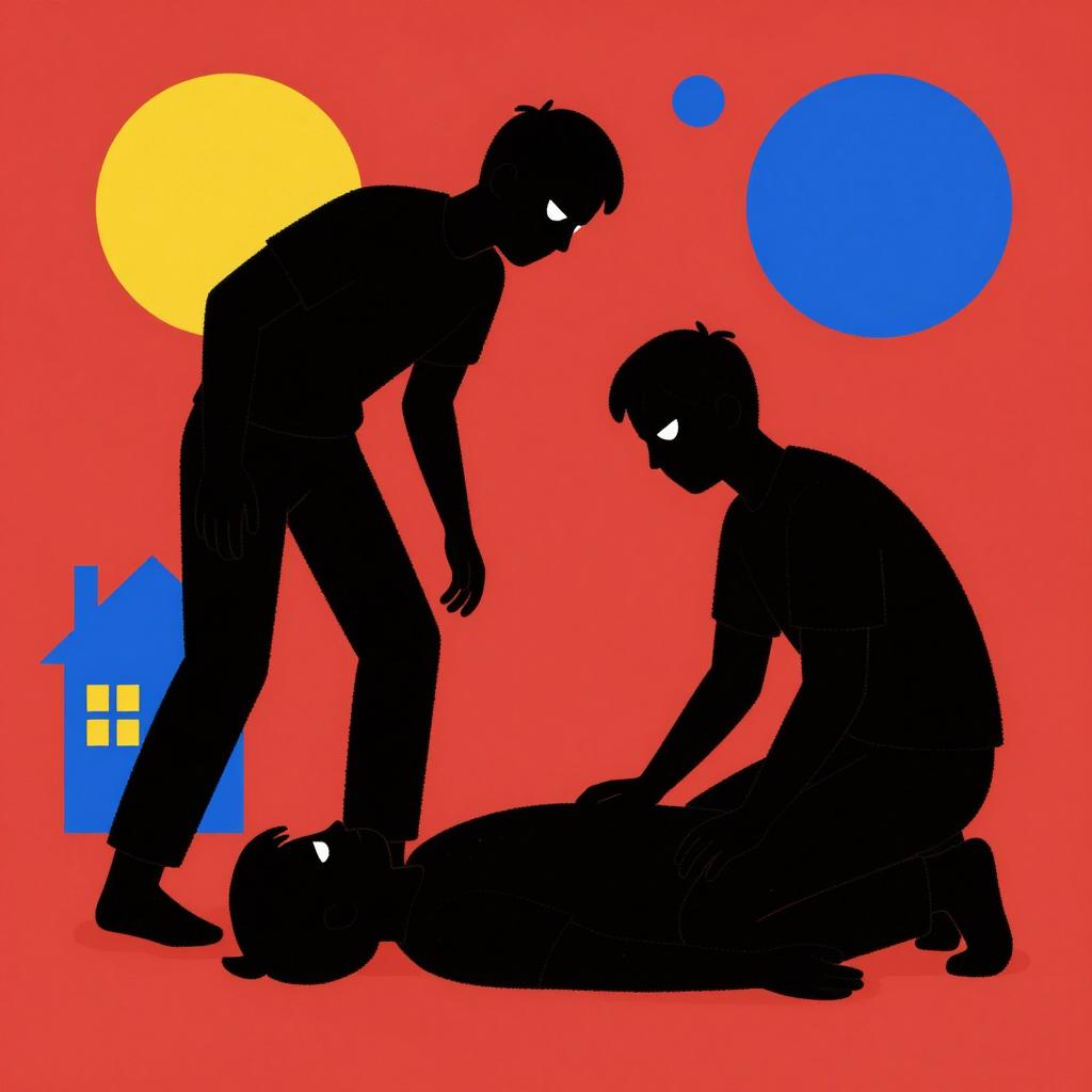 Illustration of three black silhouetted figures with intense expressions. One figure stands, leaning over a fourth figure lying on the ground, while the other two kneel beside the fourth figure. Bright red background with large, colorful circles. Small blue house with yellow windows on the left.
