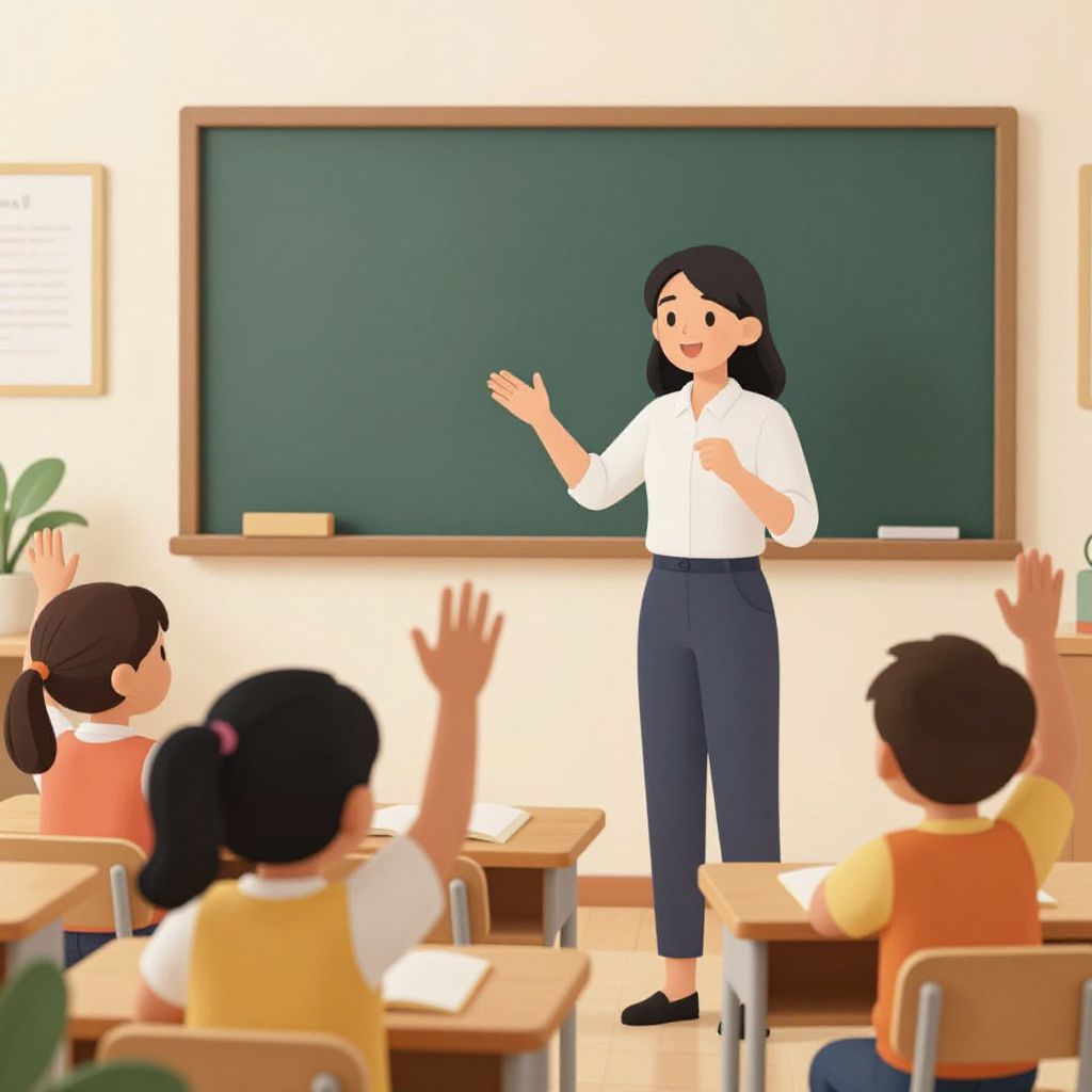 Digital illustration of a classroom scene. A smiling, light-skinned woman with black hair, wearing a white blouse and navy pants, stands in front of a large green chalkboard. She gestures with her right hand. Four children, diverse in appearance and wearing colorful school uniforms, sit at wooden desks with raised hands, facing her. A small potted plant is in the left background, and a framed picture hangs on the wall. The classroom has a bright, cheerful atmosphere.