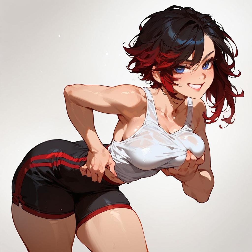 Score_9, score_8_up, score_7_up, score_6_up, score_5_up, score_4_up, ruby rose, black eyes, (black hair:1.1), gradient hair, red hair, smug, closed mouth, solo, standing, cowboy shot, medium breasts, thick thighs, white tank top, red sport shorts, arched back, leaning forward, breast grab, groping, breast squeeze, black background, simple background