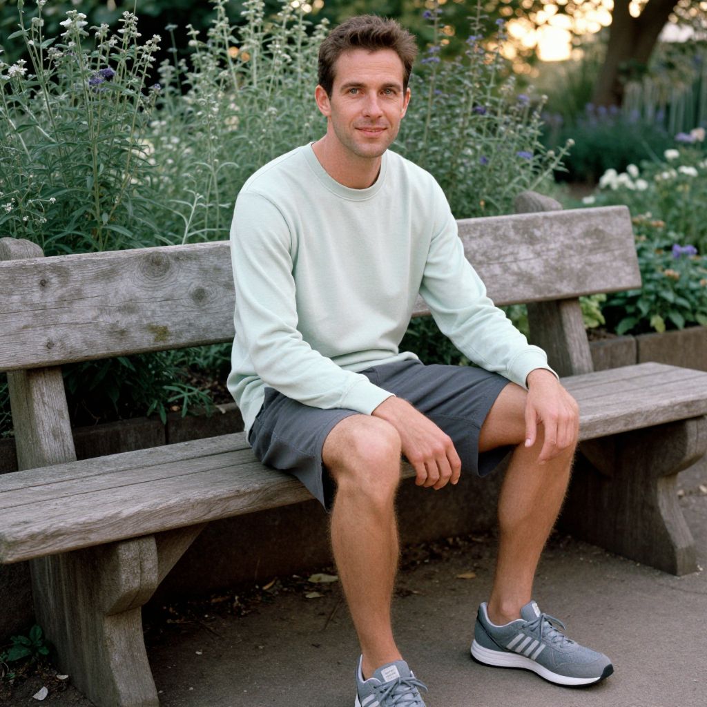 A man, soft long sleeve crew neck, pastel green, charcoal gray shorts, gray tennis shoes, casual yet sporty look, fragrant herb garden, rustic wooden benches, kodak sp analog photo, relaxed smile, warm sunlight filtering through leaves. Man has masculine face and piercing eyes
