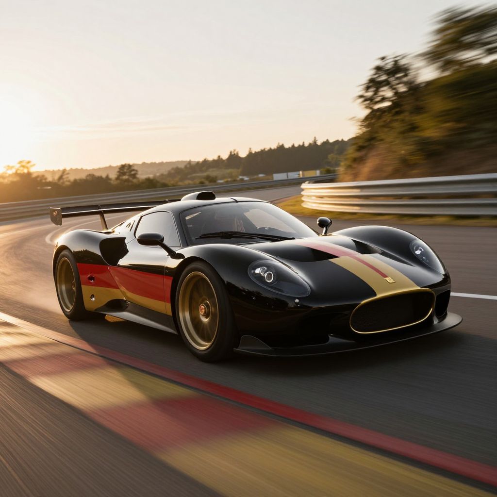 A classic sports car racing down a winding road painted in the German flag colors black, red, and gold, motion blur effect, sunset lighting highlighting sleek curves, realistic and energetic automotive scene.