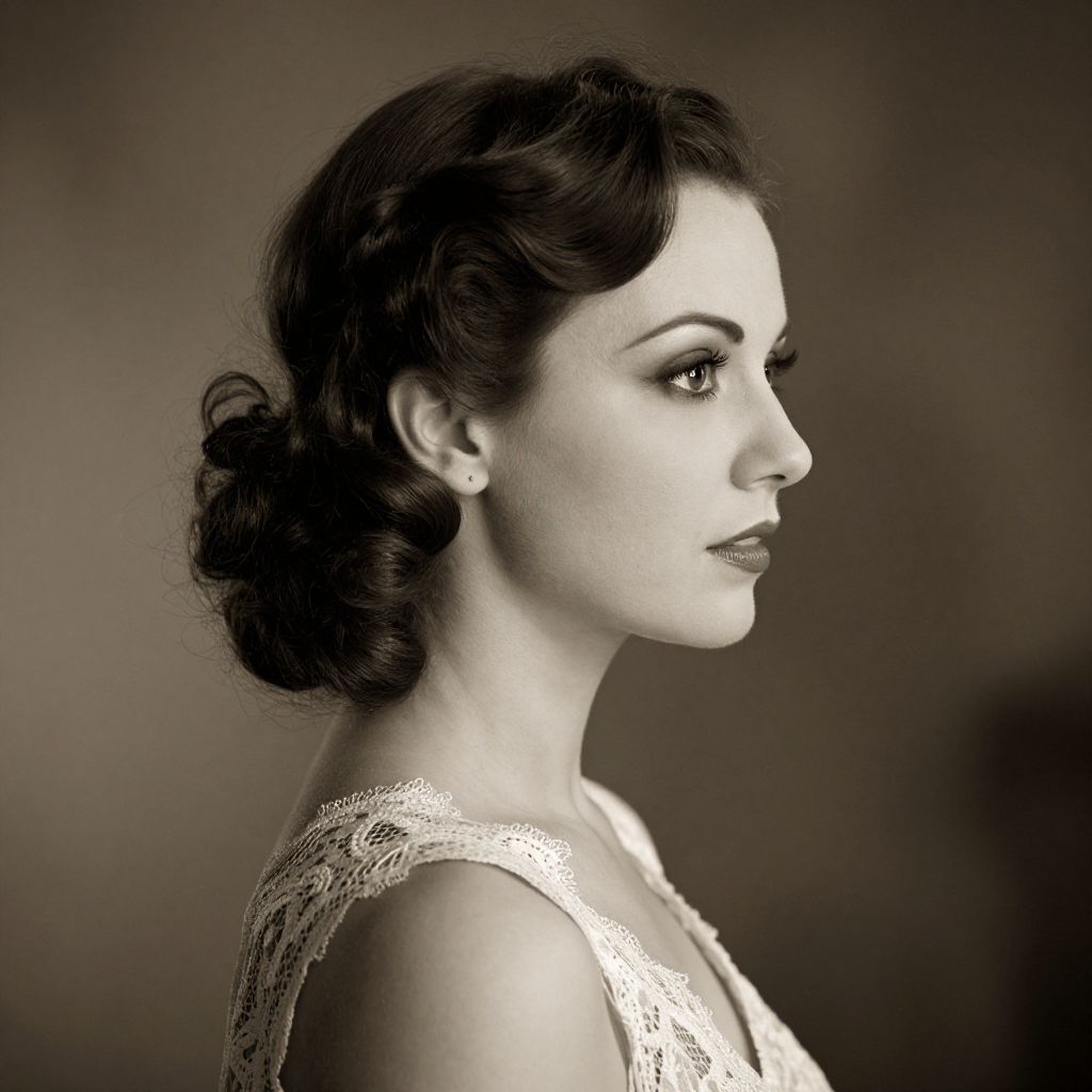 Profile portrait of an elegant Caucasian woman styled in a classic 1940s vintage look. The image features a sepia tone with soft focus and warm shadows, highlighting her intricate lace clothing and classic curled hairstyle. Makeup is subtle yet precise, enhancing her eyes and lips. The background is moody and atmospheric, adding to the fine art photography aesthetic.