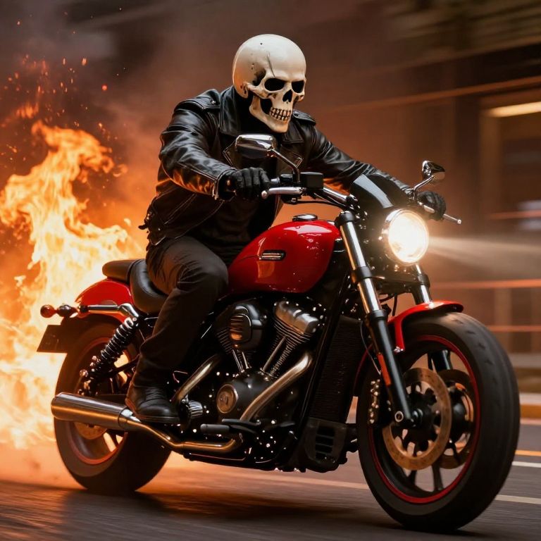 Ghost Rider rides a sleek black motorcycle with a vibrant red fuel tank, illuminated by a glowing headlight, as flames engulf the background, casting an intense orange glow around the skeletal figure clad in a dark leather jacket.