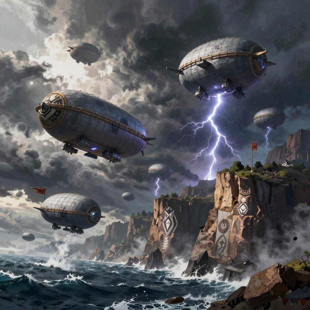 Eldian fleet of airships soaring above rugged cliffs and stormy seas, adorned with tribal symbols and flags, dramatic clouds and lightning, epic fantasy concept art with dynamic composition.