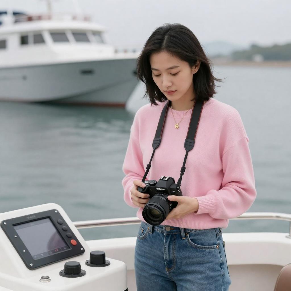 Young woman with dark hair in a ponytail, wearing a yellow sweater and blue jeans, sitting on a boat seat, focused on a laptop. Gray boat with metal railings, green bag on right. Calm water in background. Casual, relaxed pose.