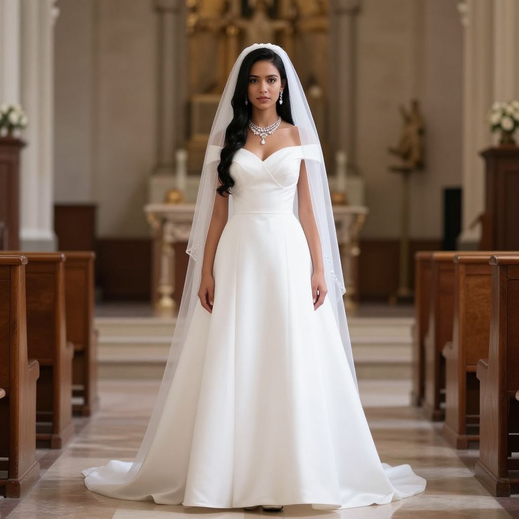 Photograph of a South Asian bride standing in a dimly lit church aisle. She has long, wavy black hair and wears a white, strapless, satin wedding gown with a sweetheart neckline and a full skirt. A long, white veil flows down her back. She is adorned with a silver necklace and matching earrings. The church background includes wooden pews on either side, a stone altar, and ornate religious decorations. The bride stands centered, illuminated by natural light, creating a stark contrast with the darker surroundings. The overall mood is elegant and solemn.