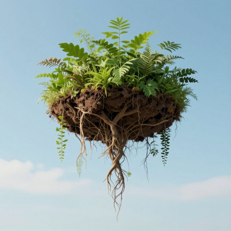Photograph of a floating, spherical clump of soil with visible roots dangling below, surrounded by various green ferns and plants. The soil is dark brown, rich, and textured, with roots intertwining at the bottom. The plants are vibrant, with different shades of green, and their leaves are delicate and feathery. The background is a clear, bright blue sky with no clouds, emphasizing the floating, weightless appearance of the soil and plants. The image conveys a sense of growth, sustainability, and the concept of "floating gardens" or "sky gardens."
