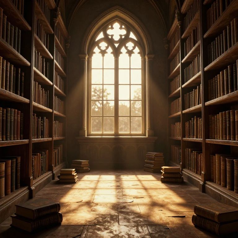 A digitally rendered, atmospheric depiction of an ancient library bathed in dramatic golden-hour sunlight streaming through a gothic arched window, casting intricate shadows over stone-tiled floors scattered with books, evoking a sense of timeless mystery and whispered secrets.