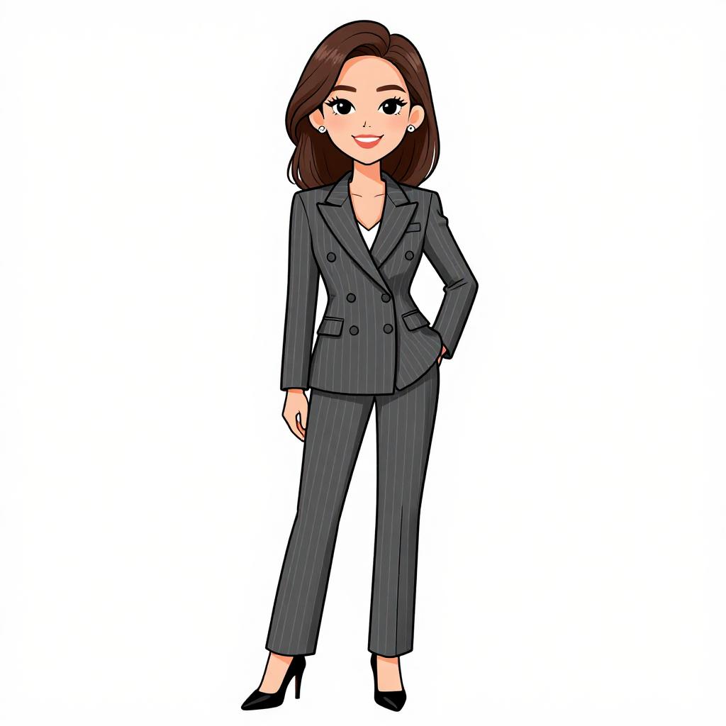 Woman with pretty face and pretty hair. smiling Woman, minimalist, tailored pantsuit in beige, relaxed fit, double-breasted blazer with oversized silhouette, wide lapels, straight-leg trousers, no visible shirt, black strappy sandals, no visible jewelry, hair down with natural styling, plain white background. --sref 1467