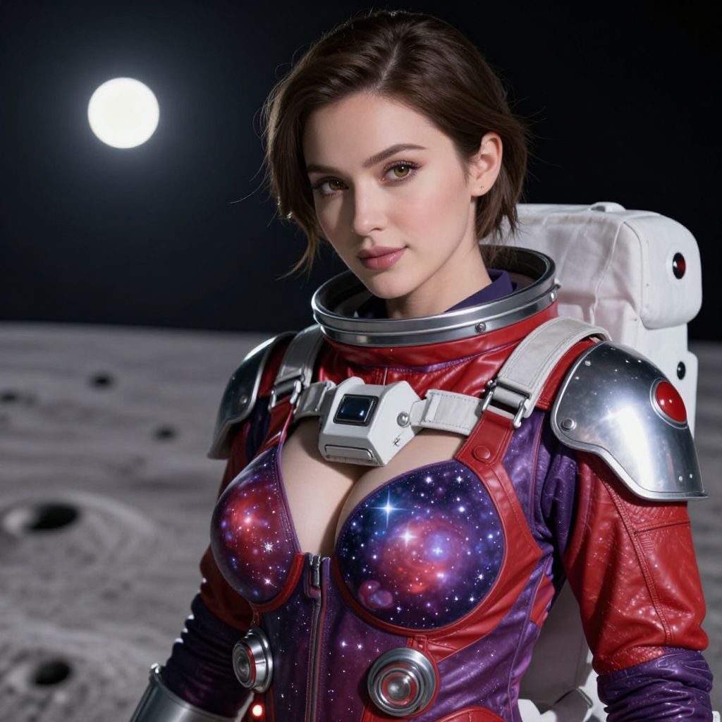 Photorealistic CGI of a beautiful woman in a red and purple galaxy-patterned spacesuit with metallic armor, standing on the moon under a bright full