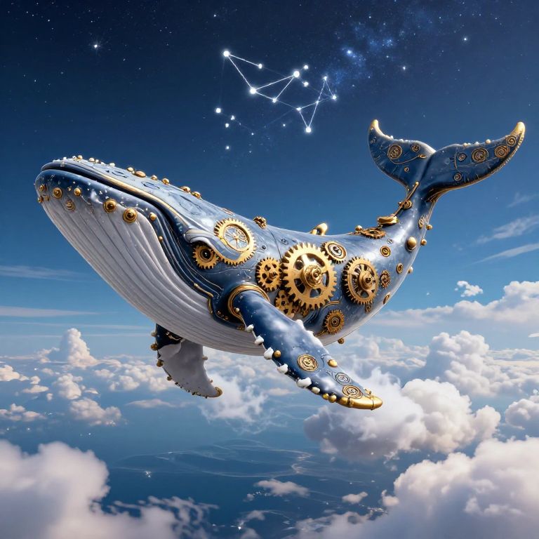 A steampunk-inspired digital artwork depicts a colossal, clockwork whale soaring through a surreal desert sky, its metallic body adorned with intricate gears and glowing orbs, leaving behind a trail of mechanical stars that transform into mythical constellations under dramatic golden-hour lighting.