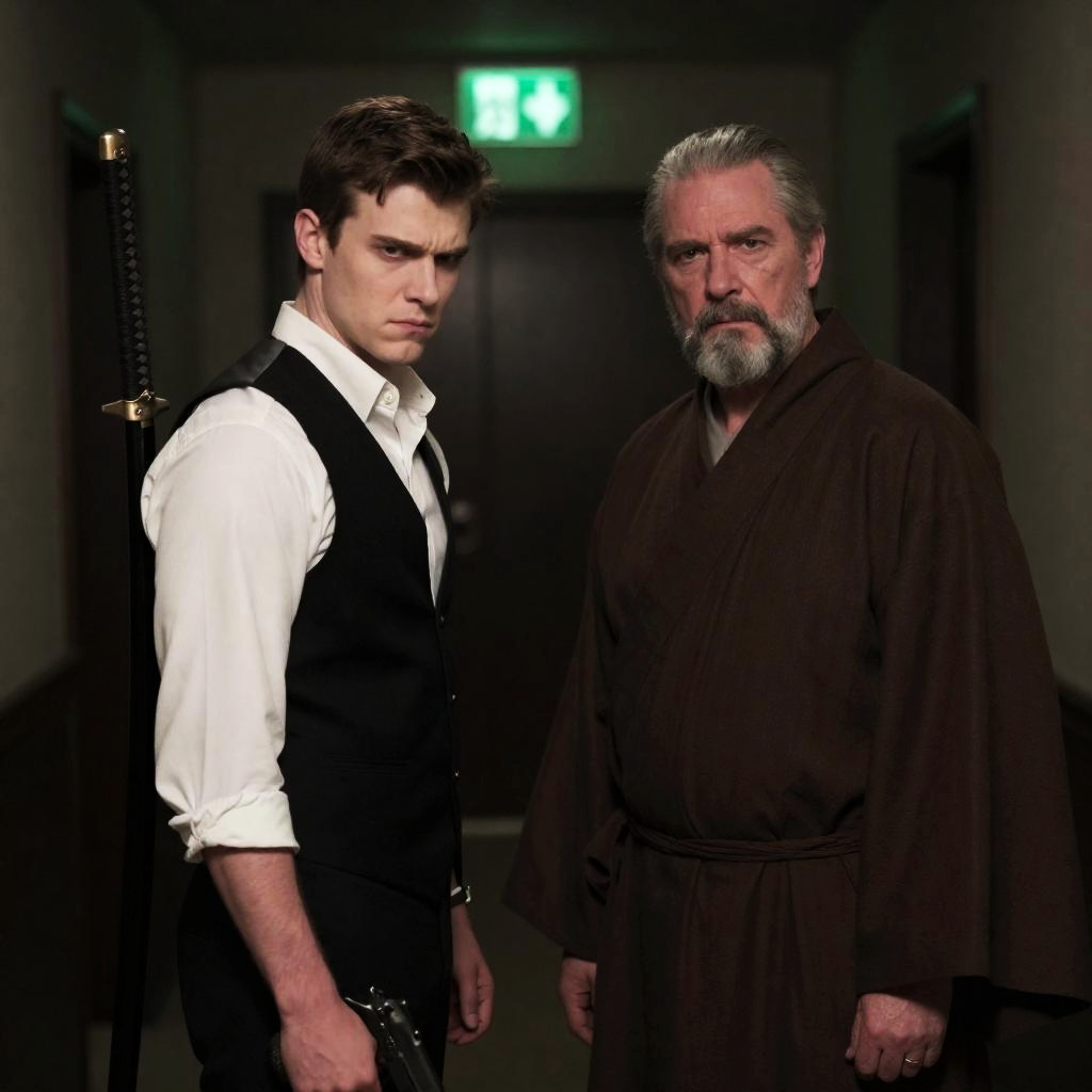 Photograph of two men, both wearing black leather jackets. The older man with graying hair and a stern expression stands left, while the younger man with short brown hair and intense gaze holds a rifle over his right shoulder. Urban cityscape in the background. The younger man's left arm rests on the older man's shoulder. Overcast sky.