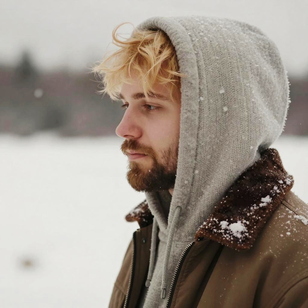 Blonde person with a beard, cozy winter outfit, snowy landscape background, soft focus, warm color palette, intimate and inviting scene