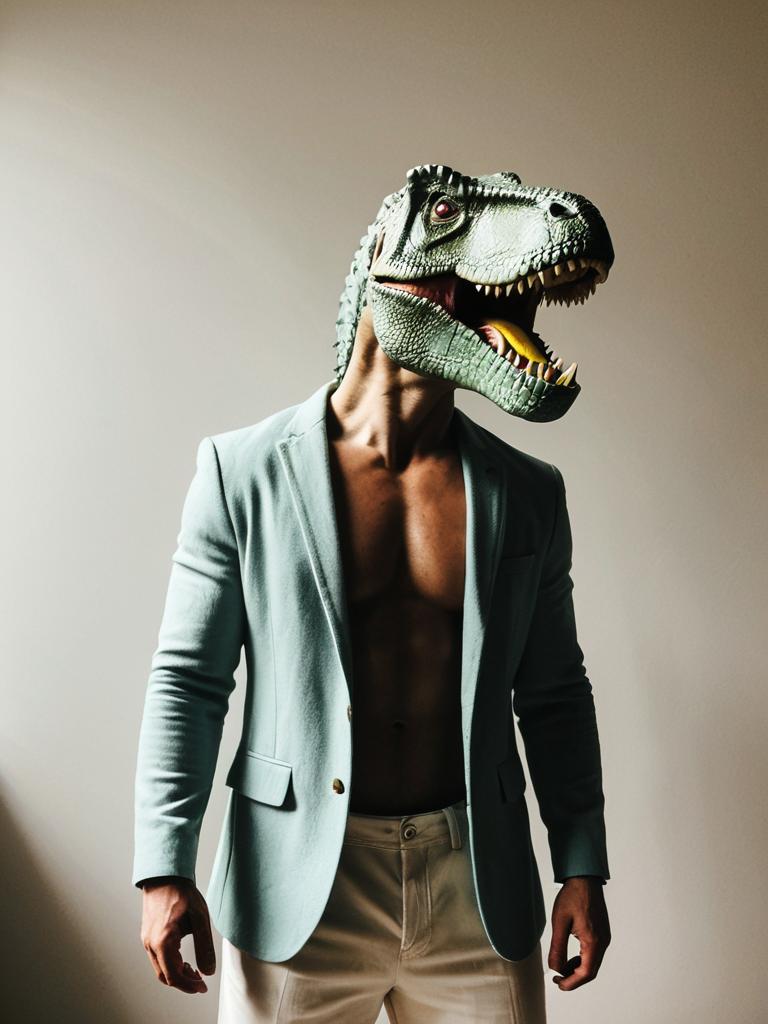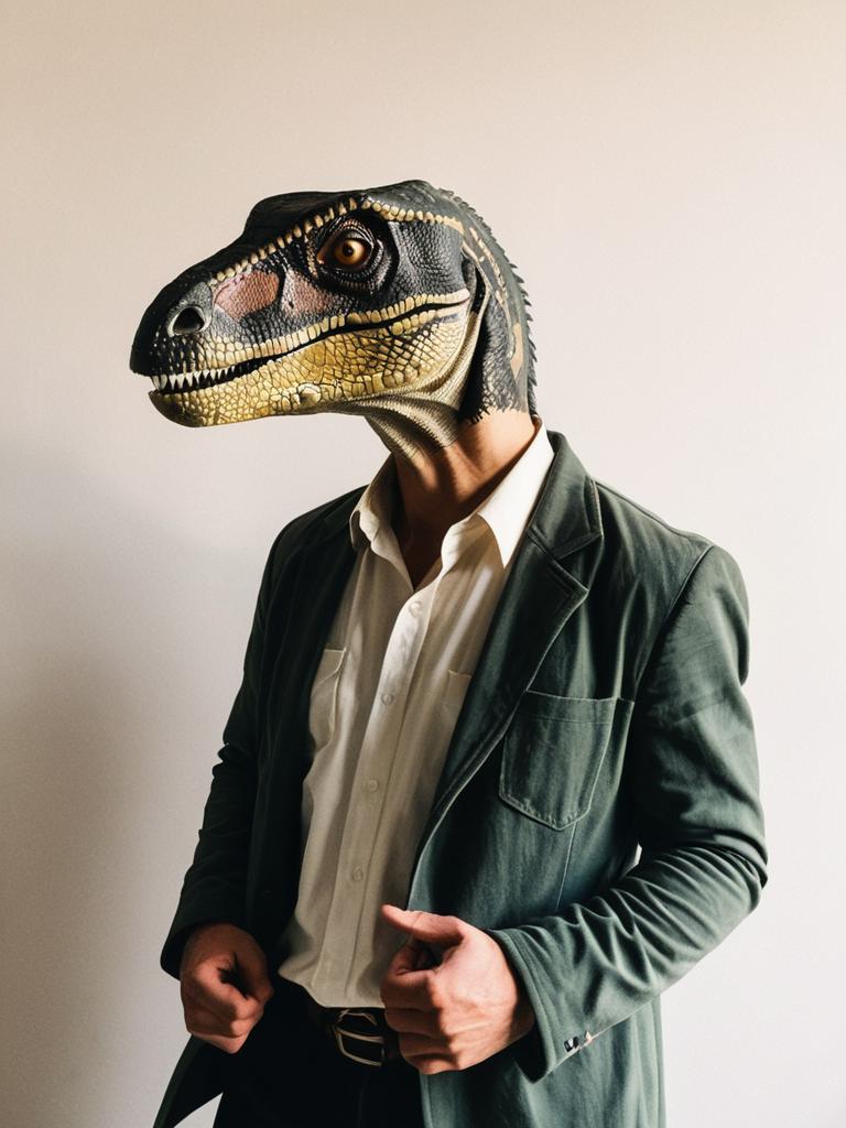Man cosplay. Wearing Rexy (Jurassic Park) costume. Realistic photo. Dressed as Rexy (Jurassic Park) --sref 1399